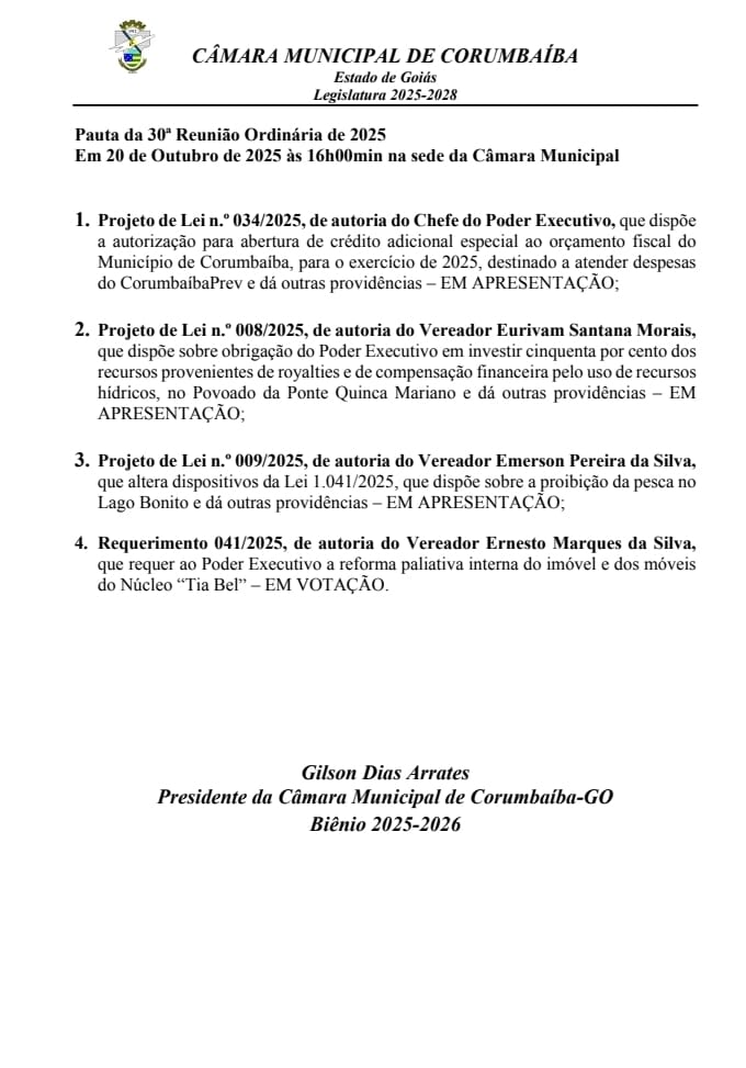 Pauta da 30ª Reunião Ordinária da Câmara de Vereadores de Corumbaíba 2025.