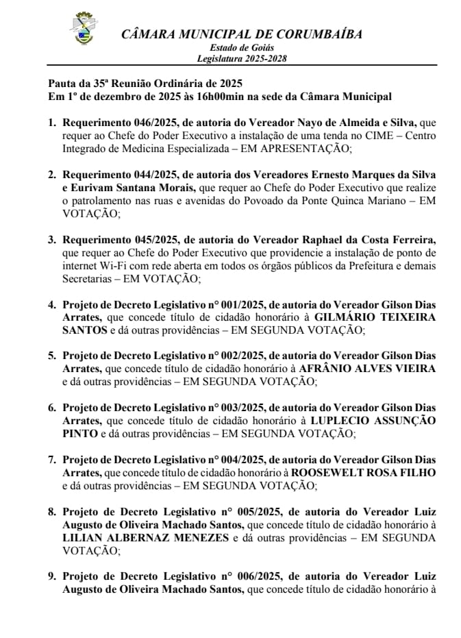 A reunião acontece dia 01/12/2025 às 16:00hs, na sede da Câmara.