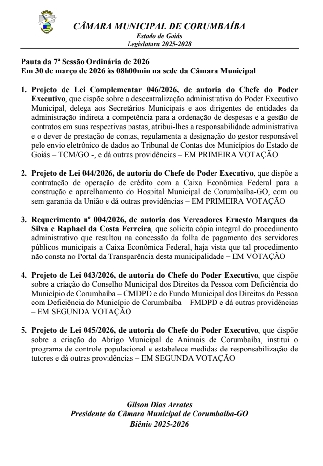 Pauta da 33ª Reunião Ordinária da Câmara de Vereadores de Corumbaíba 2025.