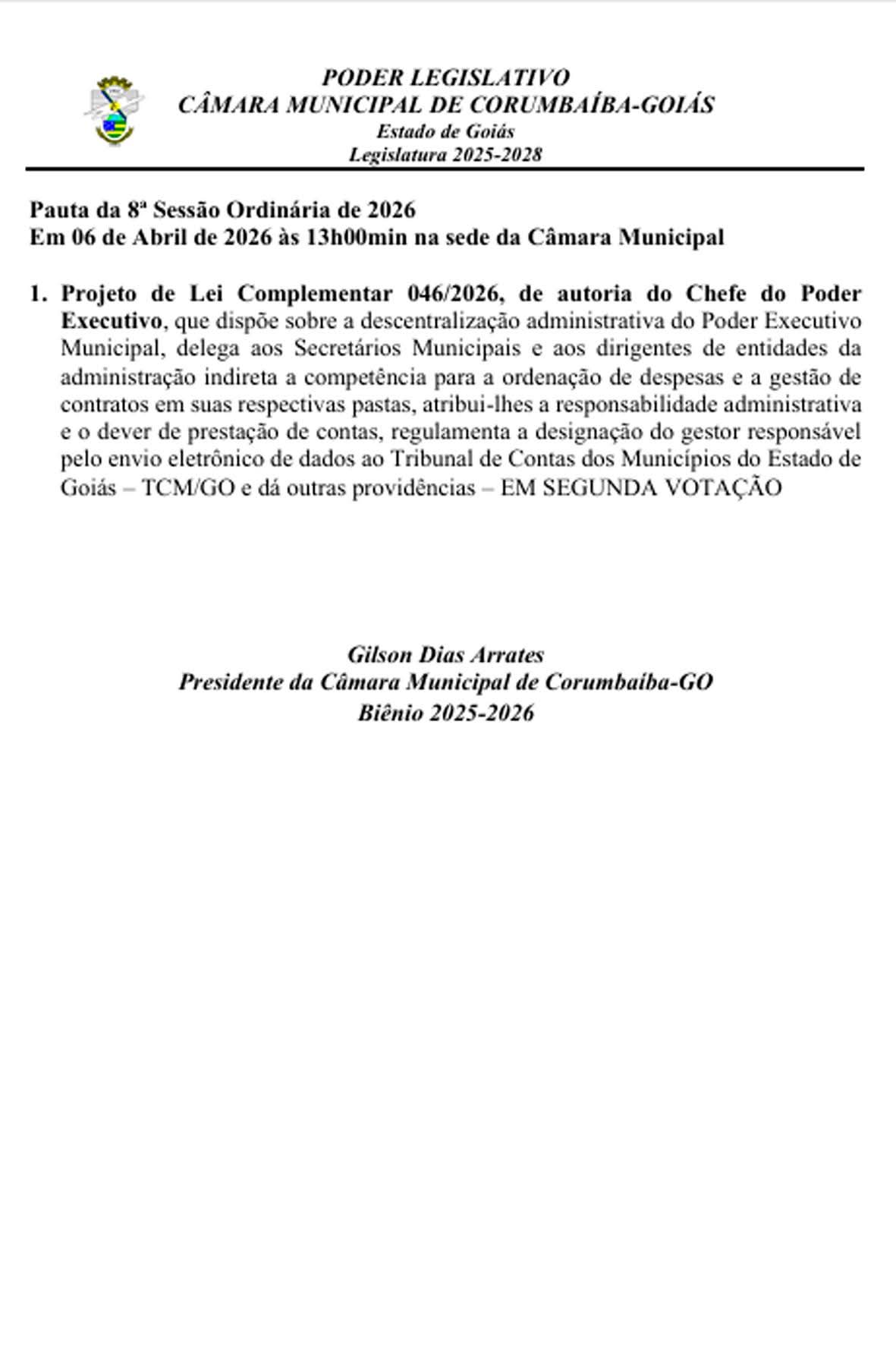 Pauta da 8ª Sessão Ordinária da Câmara de Vereadores de Corumbaíba 2026.